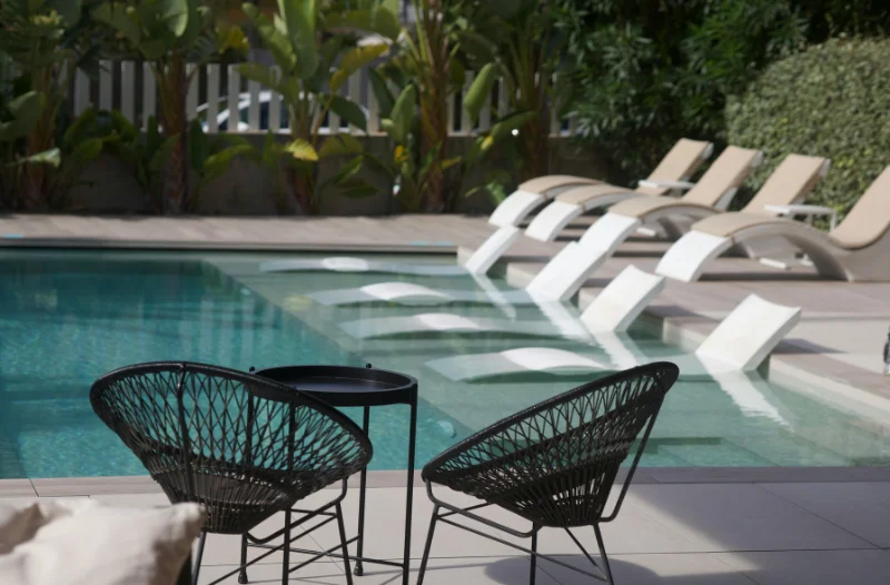 - Poolside seating and lounge areas